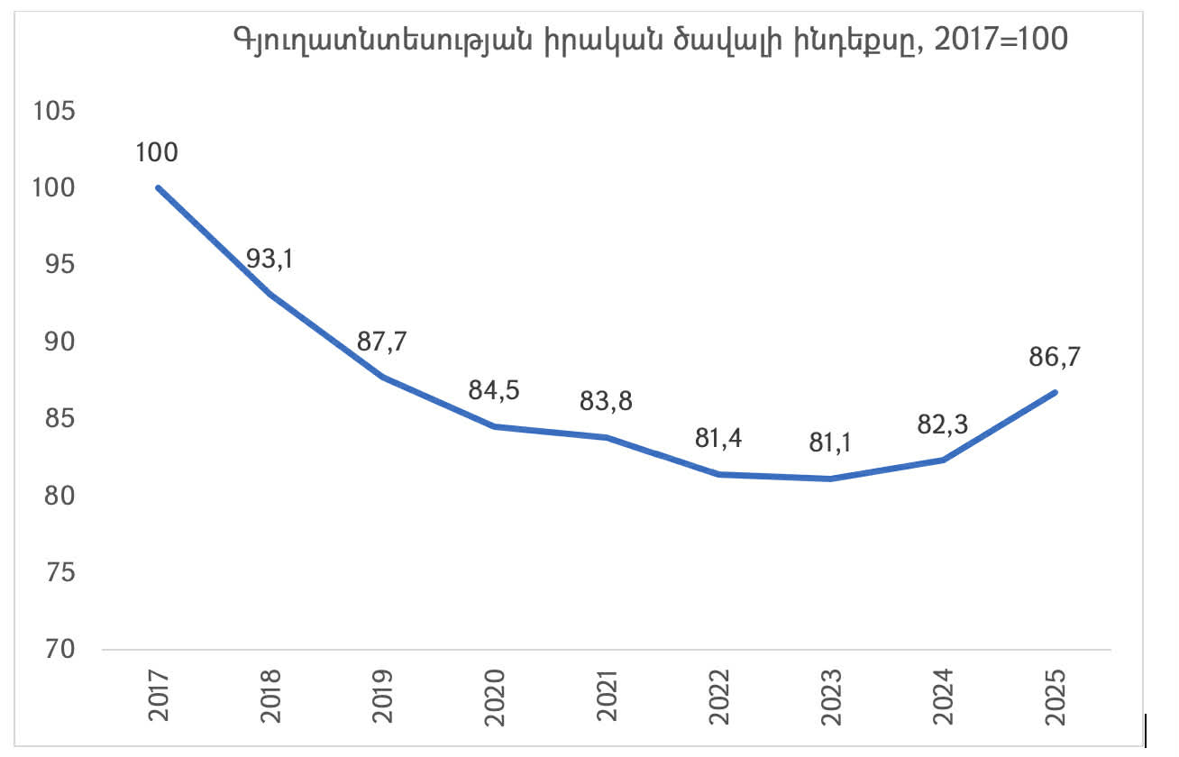 Մինչդեռ վիճակագրությամբ պատկերը շատ ավելի բացահայտ է։ 2018-2023թթ. գյուղատնտեսությունը կուտակային անկում է գրանցել՝ շուրջ 18.9%։ Թեև 2024-2025թթ. որոշ դրական տեղաշարժեր կան, դրանք չեն փոխել ընդհանուր պատկերը։ Արդյունքում, 2025թ. դրությամբ գյուղատնտեսության ոլորտի արտադրանքը դեռևս շուրջ 13.3%-ով ցածր է 2017թ. մակարդակից (տես՝ ստորև գծապատկերում)։