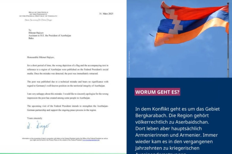 Գերմանիայի նախագահի աշխատակազմի ղեկավարը ներողություն է խնդրել Ադրբեջանից՝ նախագահի պաշտոնական էջում Արցախի դրոշի հրապարակման համար 01.04.2025
